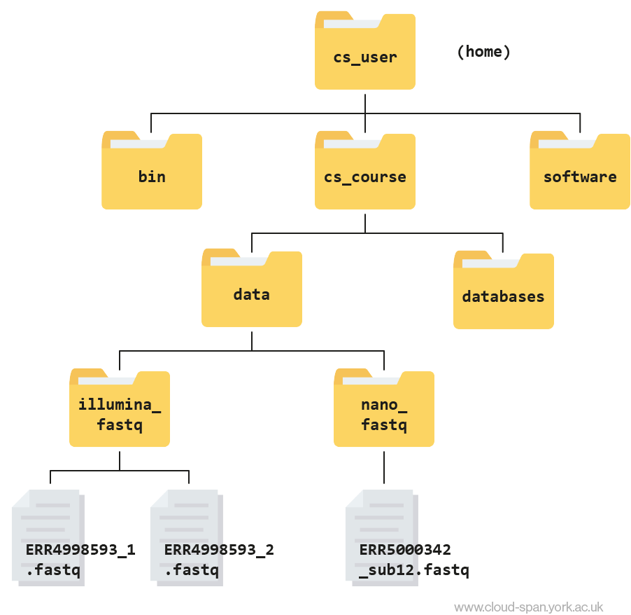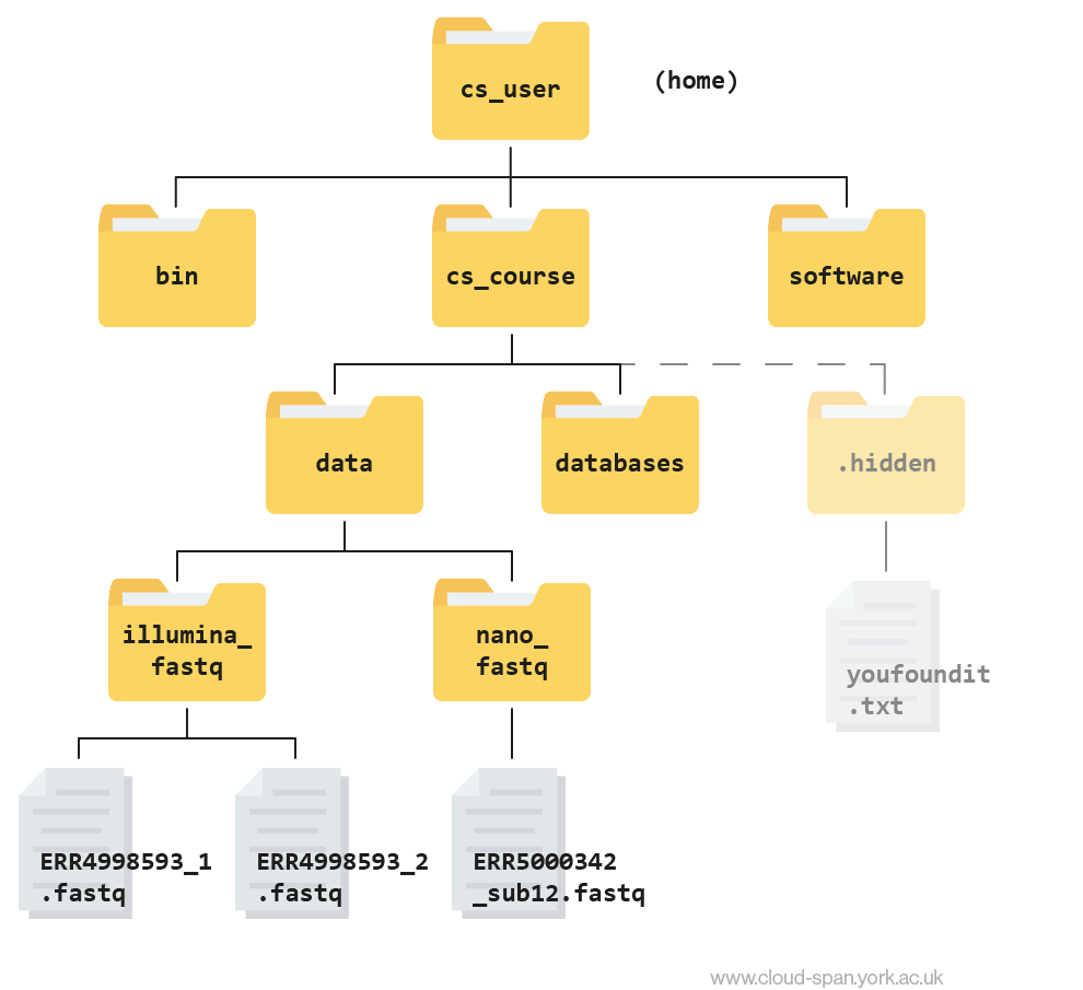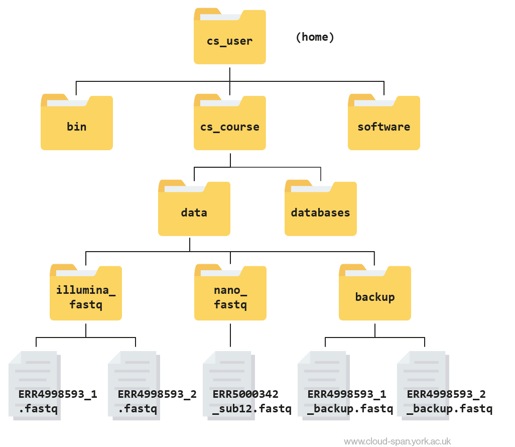 In a file system, files are organised into directories, which can also be called folders. Hopefully you will have used folders to organise your files before! Folders can contain sub-folders, which can contain their own sub-folders, and so on almost without limit.