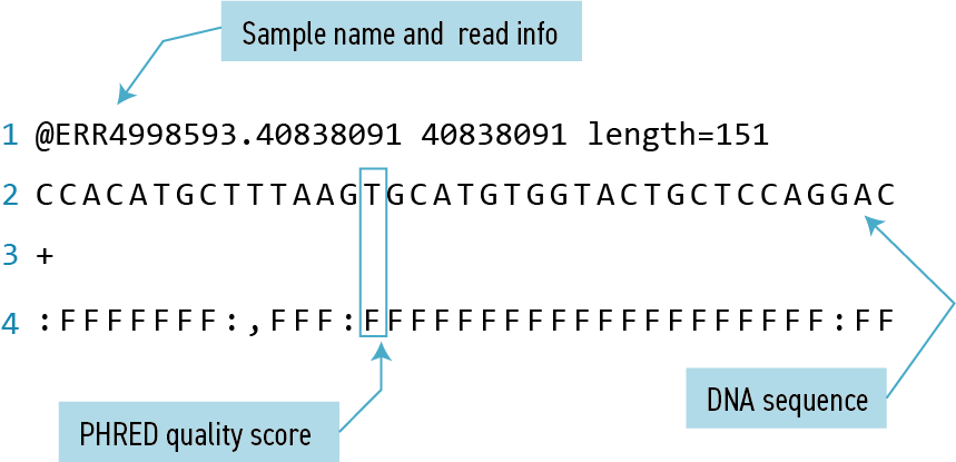 We may be interested not only in the actual sequence which contains this string, but in the name (or identifier) of that sequence. Think back to the FASTQ format we discussed previously - if you need a reminder, you can click to reveal one below.