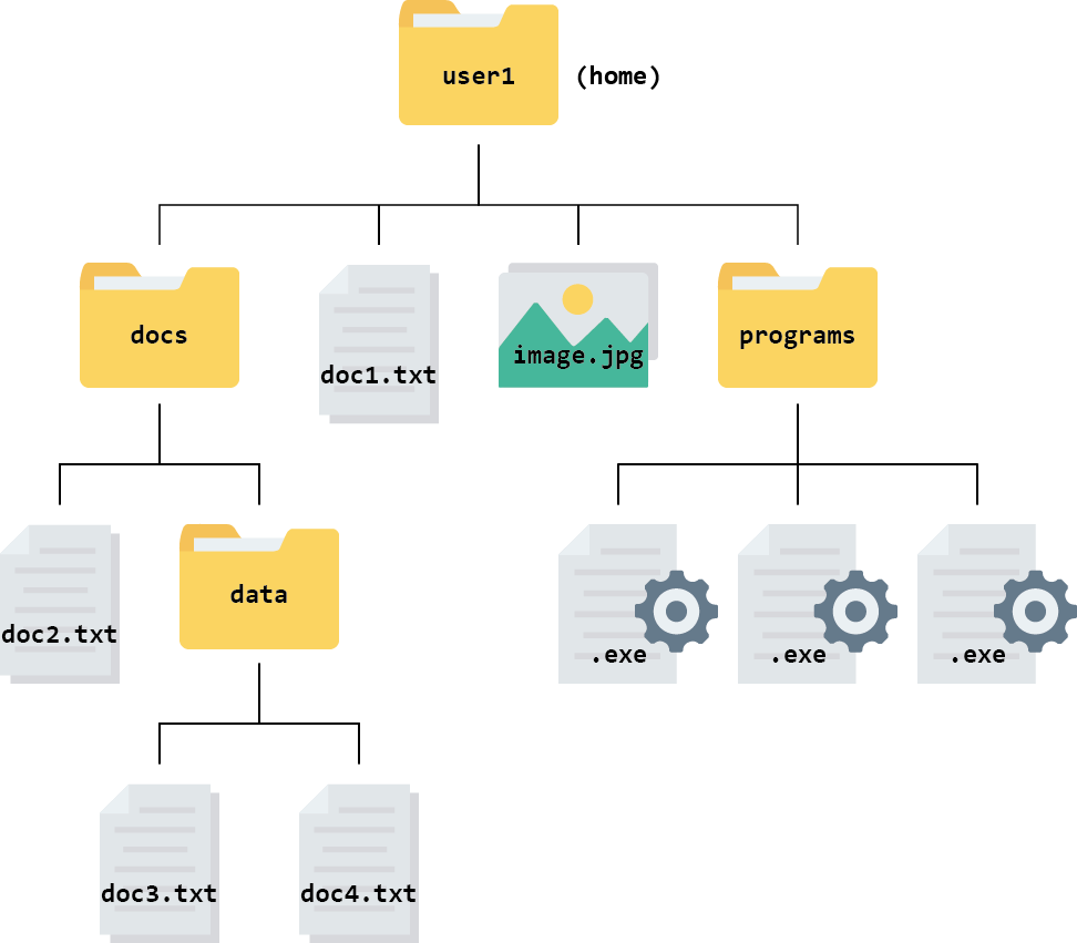 It is easiest to picture a file system, or part of it, as a tree that starts at a directory and branches out from there. This is called a hierarchical structure. The figure below shows an example of a hierarchical file structure that starts at the “home directory” of the user named user1: